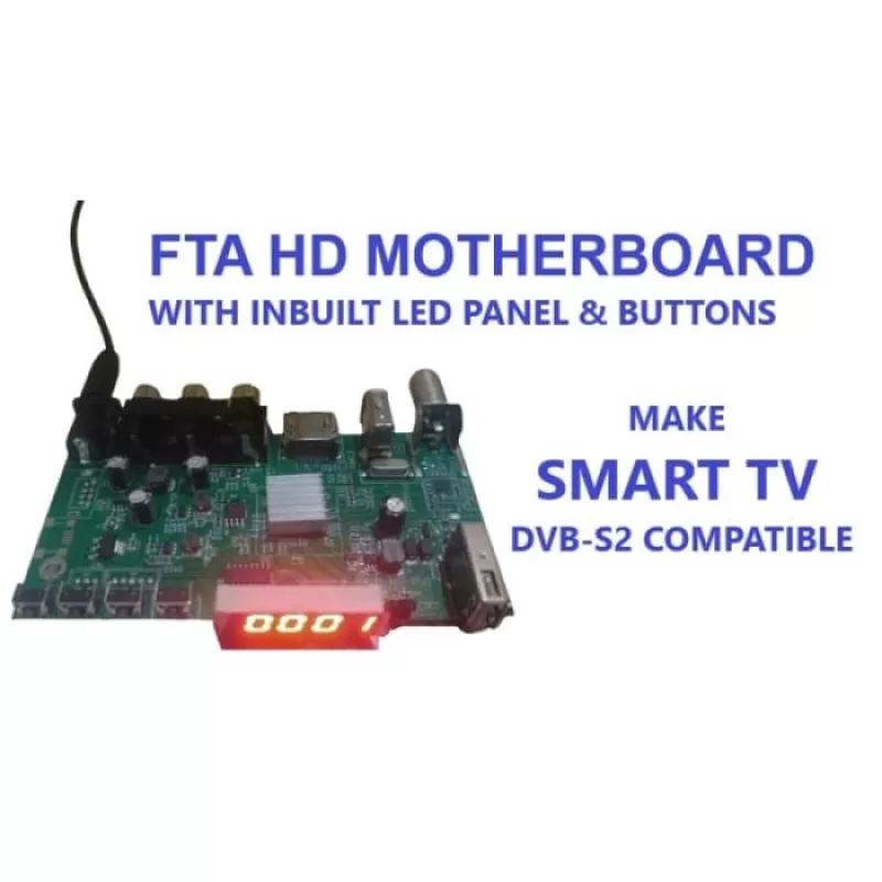 This FTA HD Motherboard (DVB-S2 Compatible) is designed to convert any TV into a fully functional HD Smart Set-Top Box. It features an inbuilt LED panel, responsive control buttons, and multiple connectivity options. With support for HD Free-to-Air satellite channels, this motherboard delivers crystal-clear picture quality and excellent signal performance.
